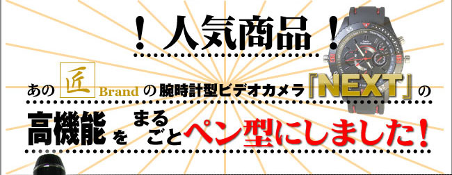 小型カメラは匠(たくみ)の技術で本格志向へ◎人気の次世代腕時計カメラ(NEXT)の機能をそのままにペン型にしました!◎さらにメモリーは増強!⇒8GB◎暗さに強い!!少ない光源でも最新暗視補正レンズ搭載でより明るい画像に!◎多くのご要望により、動体検知機能及び動…