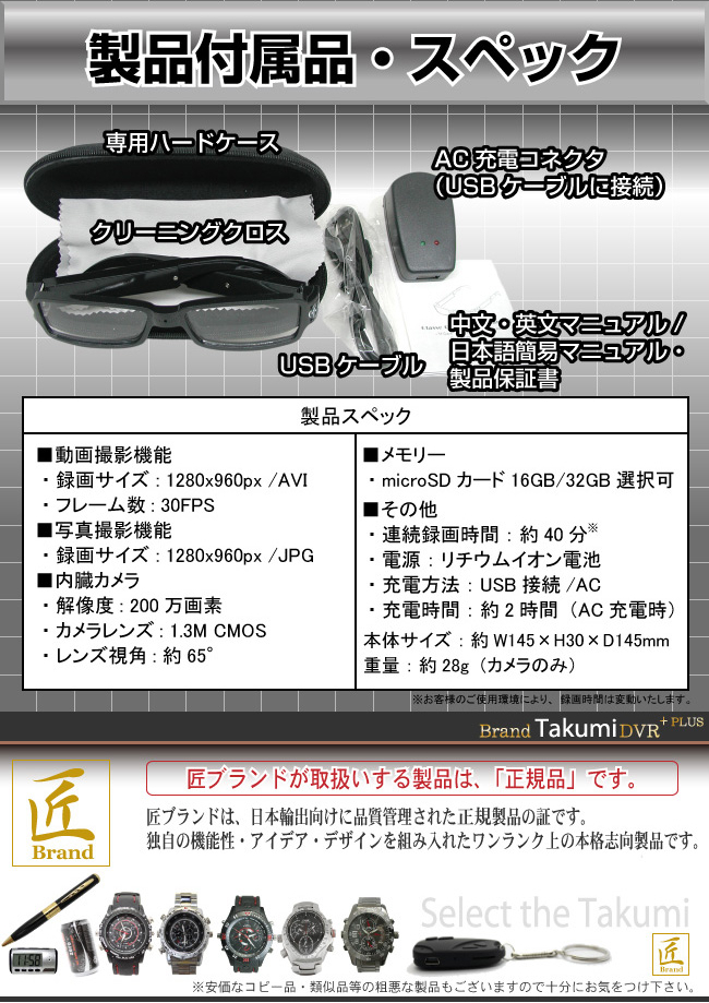 【送料無料】 【小型カメラ】メガネ型マルチカメラ(匠ブランド) 16GB通販