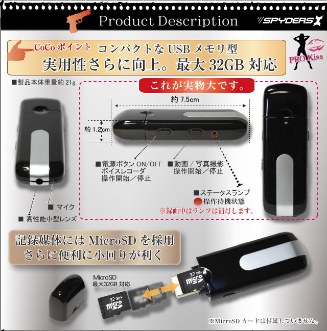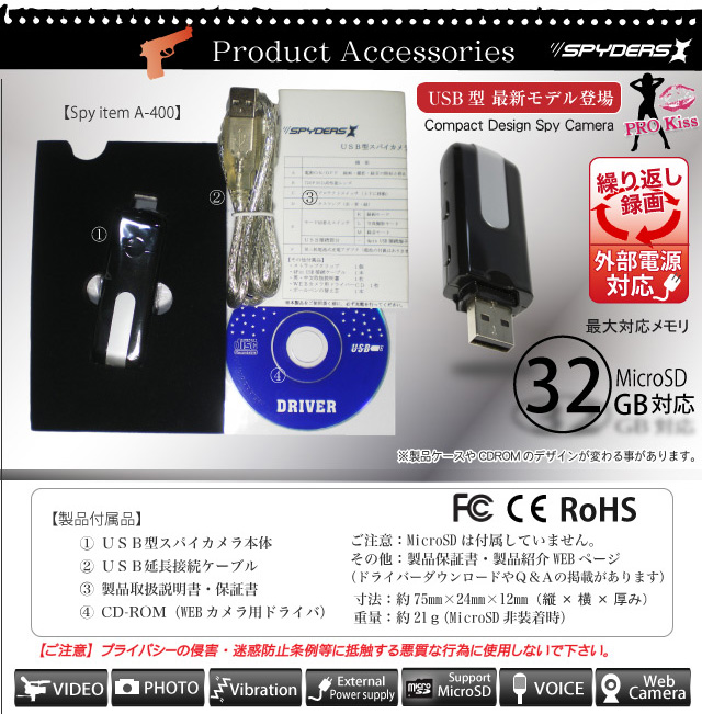 断然人気のスパイダーズXより、新型アイテム続々登場!!今話題の最新スパイアイテムをいち早くGet!!信頼のスパイアイテムをお探しならスパイダーズXで決まり!!貴方も日テレ系ドラマ『秘密諜報員エリカ』のようにスパイアイテムを使いこなして下さい!【小型カメラ】USBメモリ型スパイカメラ(スパイダーズX-A400)外部電源/最大32GB対応をお試し下さい!【小型カメラ】USBメモリ型スパイカメラ(スパイダーズX-A400)外部電源/最大32GB対応のお求めは【小型カメラ】USBメモリ型スパイカメラ(スパイダーズX-A400)外部電源/最大32GB対応通販でどうぞ!!